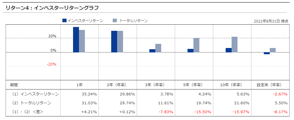 3年以上保有した場合のインベスターリターンは、トータルリターンと比べると利益がかなり低くなっています。